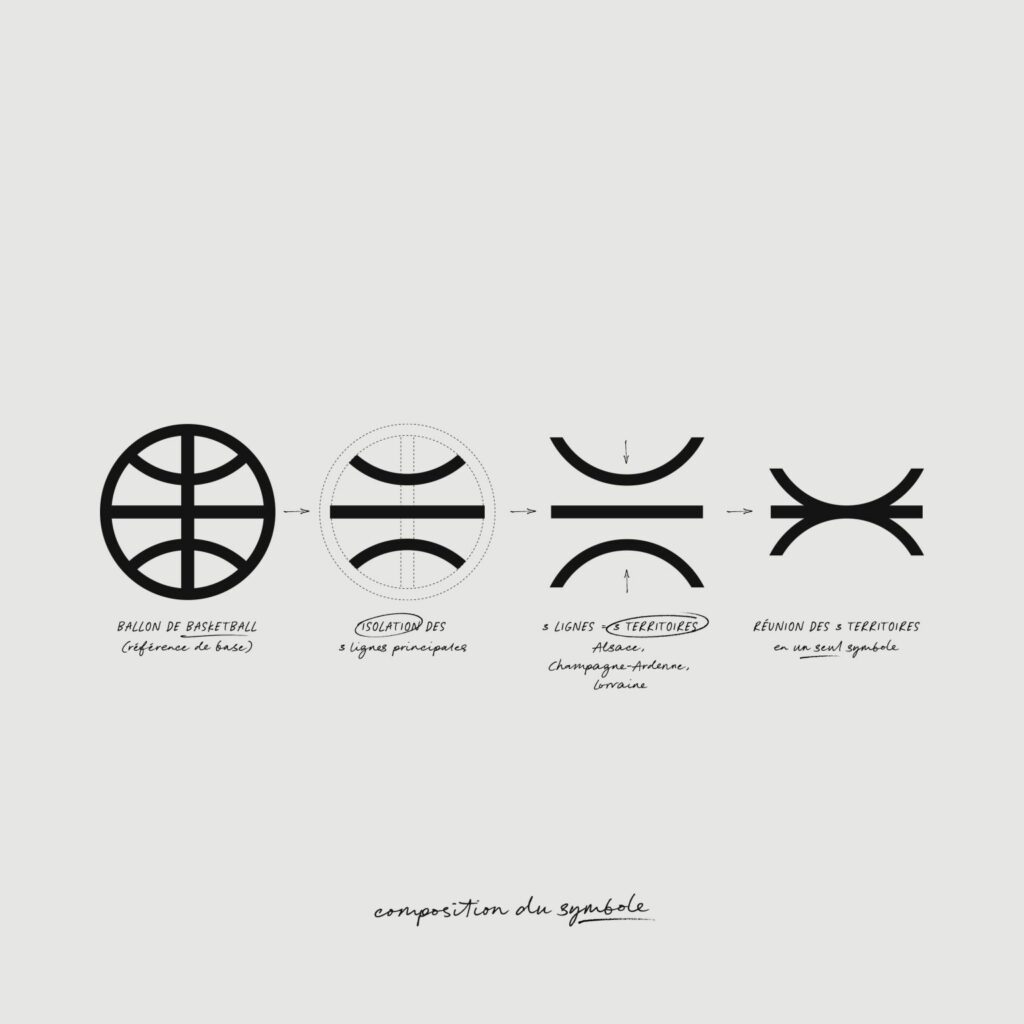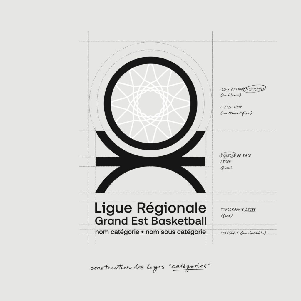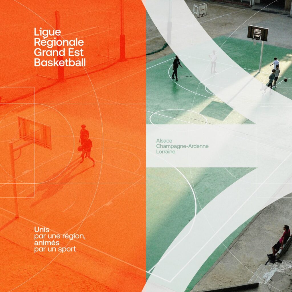 • Le rebranding de la Ligue Régionale Grand Est Basketball car on partait de très loin en termes de graphisme. Il fallait tout simplifier et en même temps il fallait avoir un symbole rassembleur qui pouvait muter pour s’adapter à toutes les variantes et tous les besoins de la ligue. J’ai remporté cette consultation car j’axe énormément mon travail sur la modularité. Mais surtout c’est un projet très sobre et radical, je suis parti d’un pictogramme de ballon de basket pour en extraire 3 bandes et faire ce sigle. C’est un peu à l’opposé des brandings plus complexes que je peux faire et je suis super content d’avoir pu travailler de cette manière. Et puis j’ai gagné un silver Award World Brand Design Society, ce qui est plutôt cool 🙂