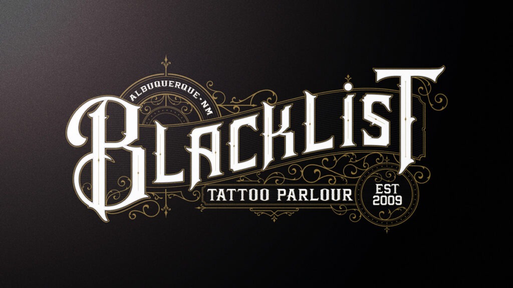 • Le logotype typographique du shop de tatouage Blacklist Tattoo Parlour à Albuquerque au Nouveau Mexique. L’histoire est un peu folle, le boss du shop a vu plusieurs de mes boulots typographiques et il a trouvé mon contact. J’ai bossé dessus plusieurs mois, dessiné toutes les typographies, fait des ornements en m’inspirant d’éléments de ferronneries de mon quartier. C’est aussi sur ce taf que j’ai développé un style plus personnel, mélangé l’univers victorien à celui du tatouage ou du metal.