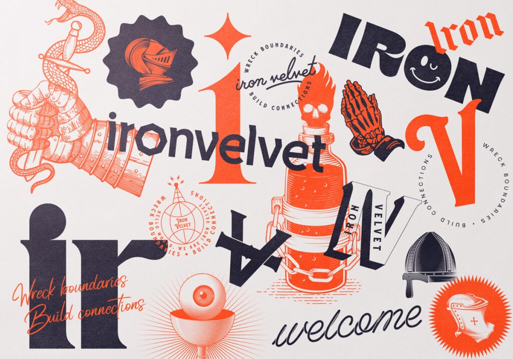 • L’identité visuelle d’Iron Velvet car elle reste à ce jour la plus importante de ma carrière, elle définit ma vision et mon style. Le fait de créer une typographie originale, de dessiner plusieurs illustrations qui vont former une boîte à outils, de faire des variantes dans la construction de cette identité pour qu’elle soit modulable et surtout d’aller à l’encontre des codes graphiques attendus dans un domaine particulier.