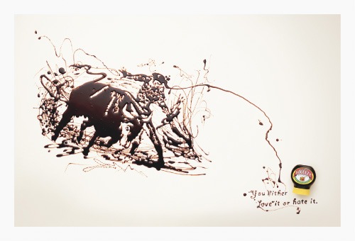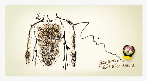 et puis la campagne Marmite, que j’ai faite à Londres avec Thierry Albert et qui m’a demandé un gros travail de D.A. et qui à bien marché. C’était ironique de bosser sur une marque si ancrée dans la culture Anglaise…C’est un peu comme si un team d’Anglais fraîchement débarqué de Londres était amené à relancer un camembert en France.