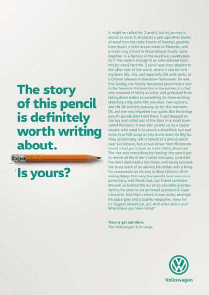 Les grandes annonces ne se nourrissent pas toujours d’un insight fort, elles peuvent reposer sur la maestria du rédacteur, la beauté d’une image ou une blague à ce point hilarante qu’elle emporte le morceau. Ce n’est pas le cas ici. L’intérêt de la campagne réside avant tout dans l’approche intelligente du sujet. Comme dans le poster The Economist qui demandait au lecteur : « Would you like to sit next to you at dinner? », chaque annonce fonctionne sur le mode de l’interpellation et pousse à l’introspection, à s’interroger sur sa propre existence, à remettre en question son quotidien. Car chacune nourrit l’idée, ô combien ironique, qu’un simple objet, aussi anodin soit-il, peut avoir vécu davantage que vous. Les accroches défient le lecteur et l’invitent, par un récit bien mené, à suivre un tel exemple… En entamant un long voyage en SUV. CQFD.