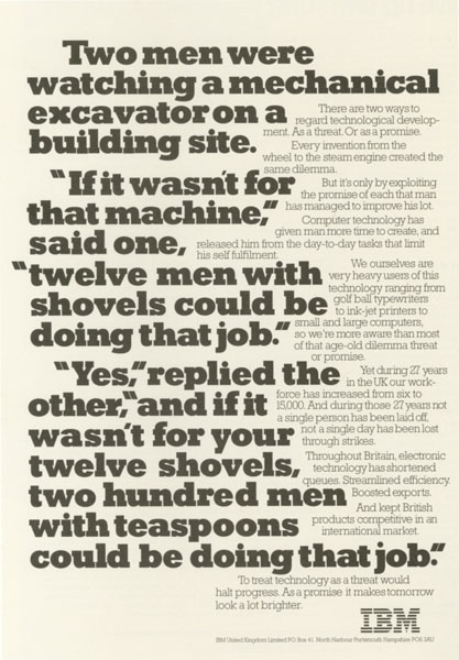 « Sans cette machine » dit l’un deux « 12 hommes seraient en train de faire le boulot avec des pelles. » « oui » répond le second « et sans tes 12 pelles, ce seraient 200 hommes pourraient faire le même boulot avec des petites cuillères. ».