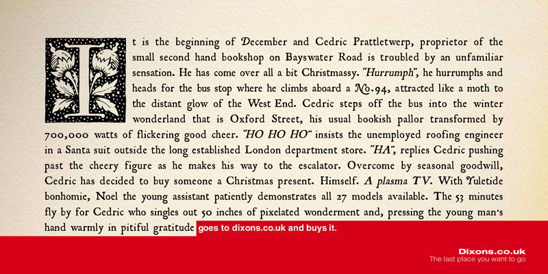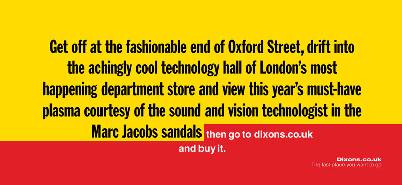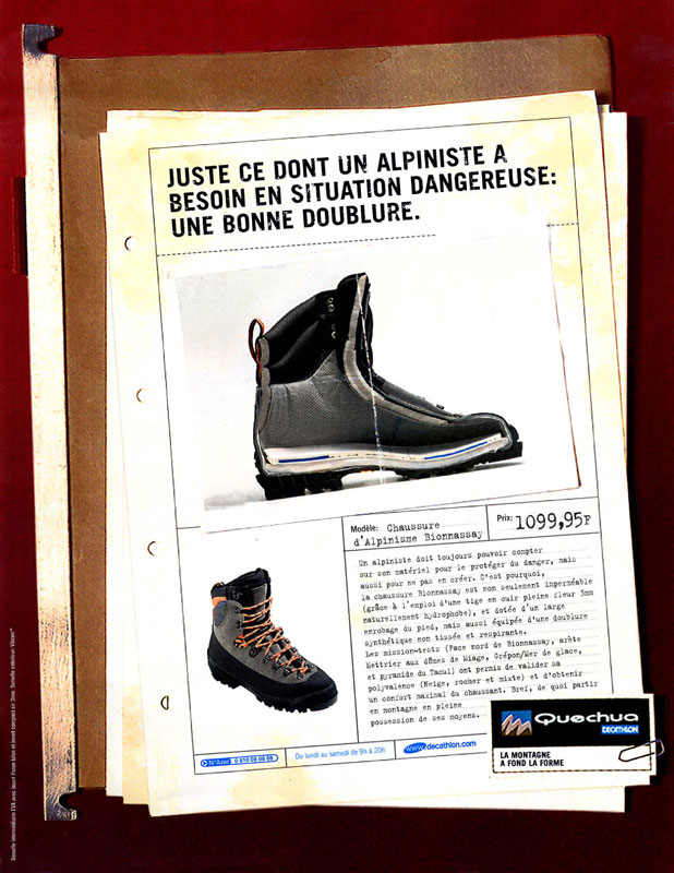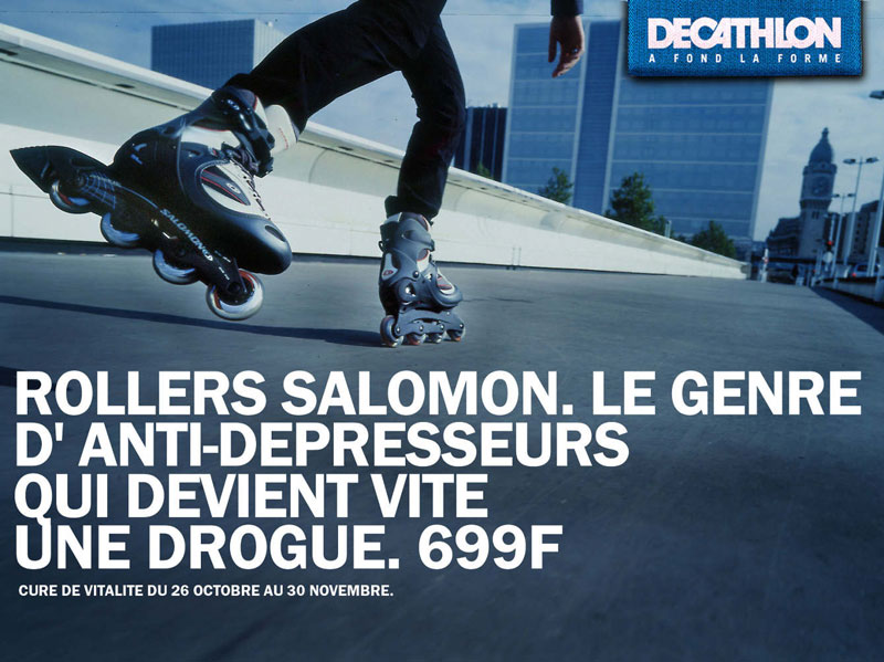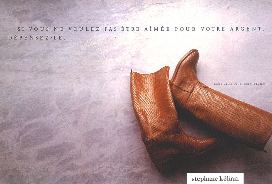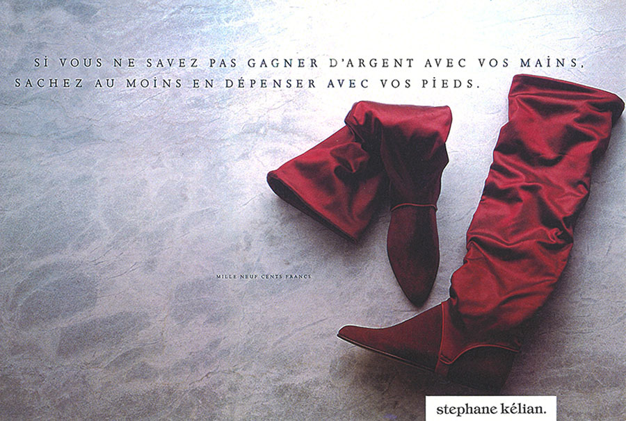 Comme tout le monde, j’ai une faiblesse pour les accroches qui claquent. La langue anglaise est parfaite pour ça. Sa concision, ses sonorités. Et je ne doute pas qu’il y aura dans ce dossier tout un tas d’annonces typo anglaises/américaines que j’adore. Pourtant, volontairement, je choisis une accroche en Français. Longue, écrite, moins connue, sans aucune chance dans les prix internationaux. Elle s’inscrit dans un courant de la publicité française qui m’a donné envie de faire ce métier. Le CLM des années 1980/1990, les rédacteurs Eric Galmard (pour cette annonce) et Pascal Manry. J’aime la spécificité française qu’il y a dans cette annonce. Il y a du style, de la poésie, de la personnalité. On parle de la diversité des boutiques en racontant une histoire qui ne semble pas commerciale. C’est alambiqué, on fait confiance à l’intelligence du lecteur. C’est tout ce qu’on doit apprendre à ne pas faire dans les écoles. La longueur, la complexité, deviennent vecteur d’impact.