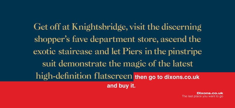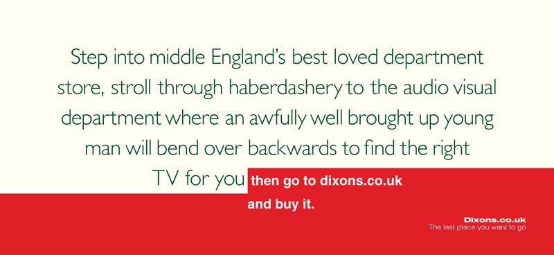 Sur le même registre, j’adore l’annonce Harley Davidson « Somewhere on an airplane, a man is trying to rip open a small bag of peanuts » qui parle de liberté et de servitude, d’aventure et d’ennui, bref, de la condition humaine, plutôt que de performance produit. J’aime aussi la campagne Dixon.go, qui s’appuie sur l’expérience consommateur pour s’en moquer, et l’affiche « cerveau de raciste », même si elle repose sur le visuel, mais c’est aussi ça, une bonne rédaction.