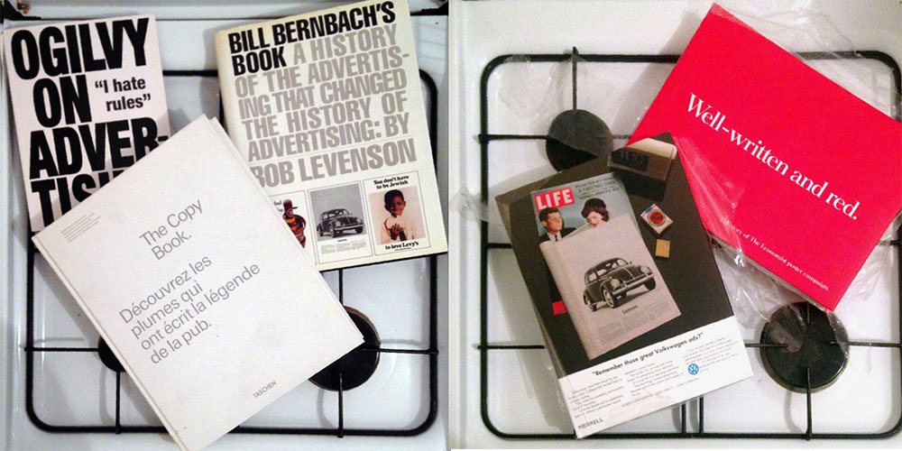 Well Written and red (The Economist, 35€) – Great VW ads (38€) – The Copy Book (15€ en petit format – la bible des rédacs, existe aussi en français) – Ogilvy on advertising (15€) – Bill Bernbach’s book (110€) – Read me (10 lessons for writing great copy) – Nouveau ? ( 9€ – Joe la pompe) – C’est quoi l’idée ? (15€, Philippe Michel) – Langue de Pub (30€) – Le monde de la pub (20€)