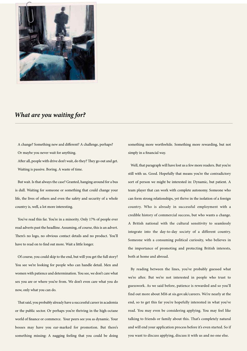 J’aime cette annonce de recrutement pour les services secrets anglais,le MI6, parce qu’elle illustre brillamment les recommandations de BillBernbach : préférer l’essentiel au superficiel, s’appuyer sur des insight qui correspondent aux aspirations profondes de l’individu, l’envie d’être aimé, de changer de vie, l’angoisse de la mort, etc.