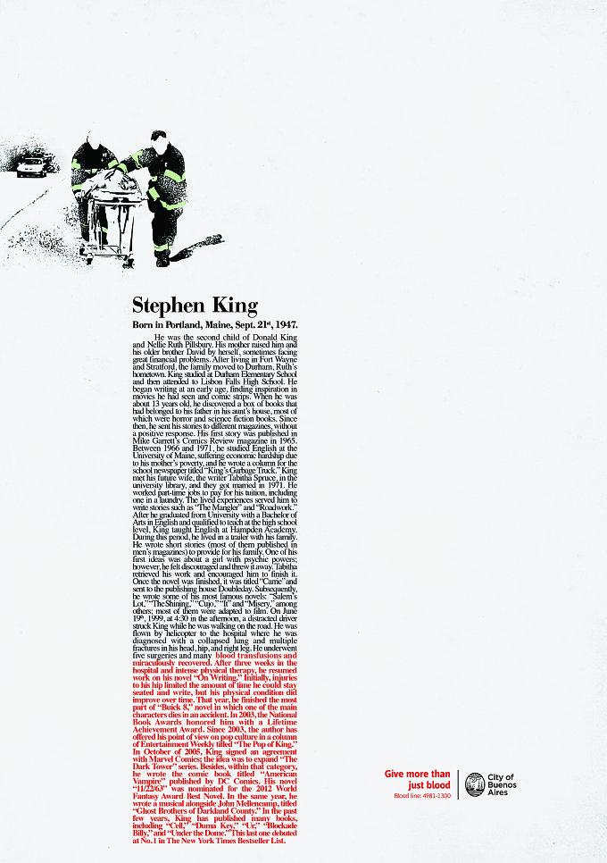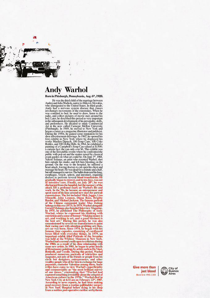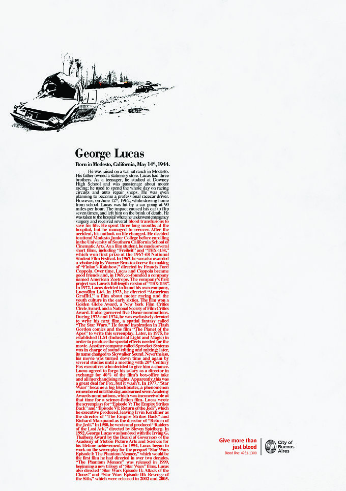 J’ai été marquée par cette campagne découverte lors d’un jury. Je sais qu’elle a été multi primée, à très juste titre : classicisme de la forme, parti pris stratégique et créatif original et utilisation de la typo à la fois simple et brillante. Finalement, c’est peut-être plus concernant pour le public de faire valoir le don du sang comme une contribution à l’œuvre de ces trois créateurs (Stephen King, George Lucas et Andy Warhol) pour leur avoir tout simplement permis de continuer leur vie…et à nous de continuer d’aimer leurs livres, leurs films et leur art. Les textes sont très longs (un pari aussi rare qu’audacieux aujourd’hui) et passionnants à lire. A mon sens , une approche sur ce sujet largement préférable à toutes celles qui jouent le pathos ou le visuels à symbolique choc, tellement plébiscitées ces dernières années.