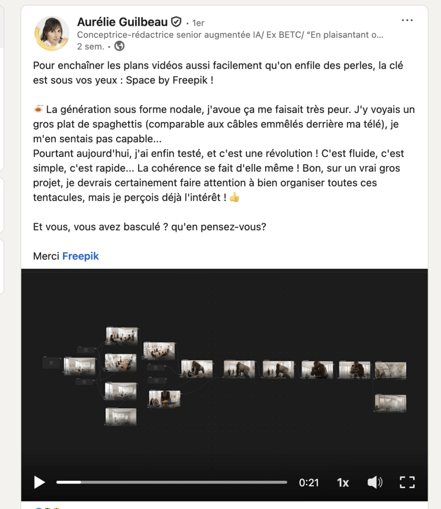 Pour la création, j’ai mon abonnement Freepik, une plateforme bien pratique parce qu’elle réunit énormément de modèles différents (dont les meilleurs : Kling, Veo, Sora, Banana Pro…), j’ai aussi pris un compte Google Flow, Midjourney, Eleven Lab (incontournable pour le son et les voix), et pour la musique, je suis restée fidèle à mon premier amour Suno. J’ai testé aussi Heygen pour les avatars, mais c’est moins mon truc.